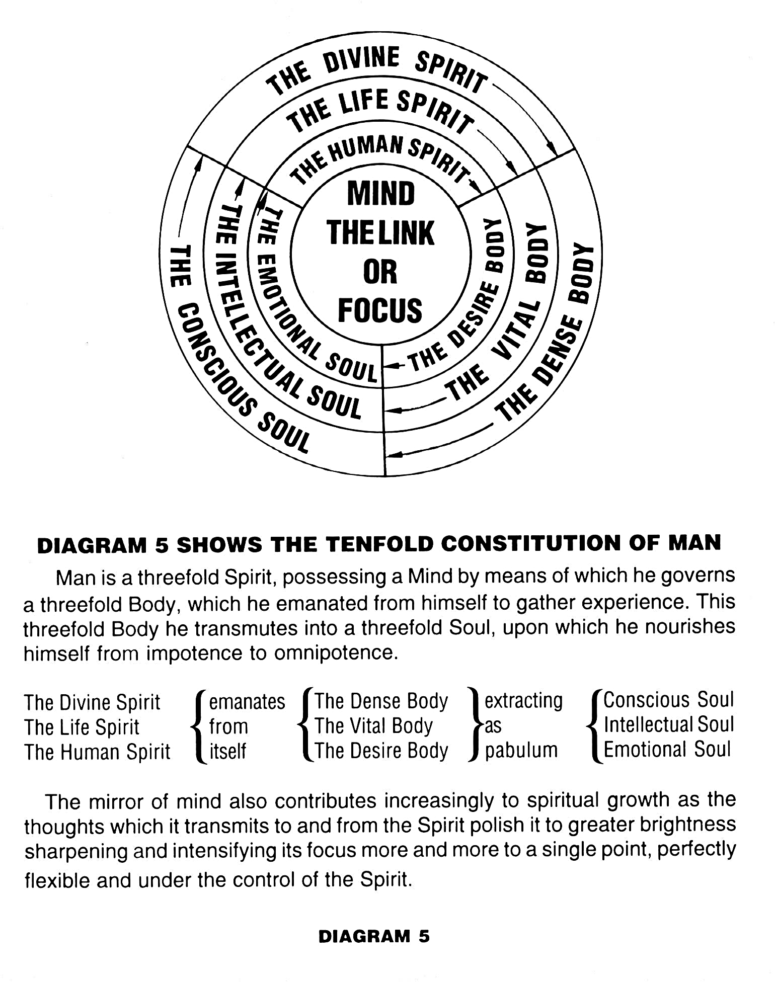 As proper food feeds the body in a material sense, so the activity of the spirit in the dense body, which results in right action, promotes the growth of the Conscious Soul. As the forces from the Sun play in the vital body and nourish it, that it may act on the dense body, so the memory of actions done in the dense body — the desires, feelings and emotions of the desire body and the thoughts and ideas in the mind — cause the growth of the Intellectual Soul. In like manner the highest desires and emotions of the desire body form the Emotional Soul.