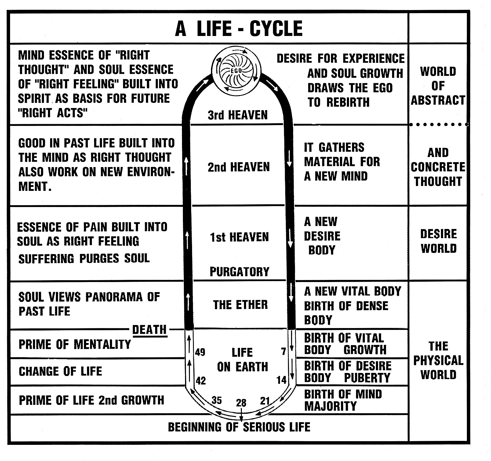 Having assimilated all the fruits of his last life and altered the appearance of the Earth in such a manner as to afford him the necessary environment for his next step towards perfection; having also learned by work on the bodies of others, to build a suitable body through which to express himself in the Physical World and having at last resolved the mind into the essence which builds the three-fold spirit, the naked individual spirit ascends into the higher Region of the World of Thought — the third heaven, Here, by the ineffable harmony of this higher world, it is strengthened for its next dip into matter.