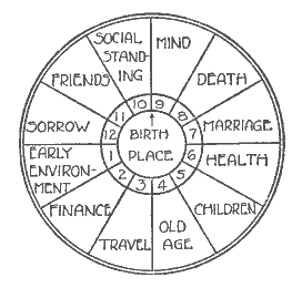A Horoscope is simply a chart of the heavens showing a certain position of the planets and zodiacal signs relative to each other and the earth. The constellations remain in the same position one to another, and are therefore called "fixed stars," but the earth and other planets constantly change. They do not return to the same relative position until after about twenty-six thousand years. Thus every scientifically calculated horoscope is absolutely individual and shows a stellar influence different from that exerted in any other life commenced at a different time. Because of the revolution of the earth upon its axis a new degree of the zodiac rises every four minutes and thus even the horoscopes of twins may differ considerably. The student will therefore realize the importance of time as a factor in casting a horoscope. There are, however, various methods of approximating the time and erecting a correct horoscope for those who do not know the hour of their birth, but that subject belongs to an advanced grade of this study.