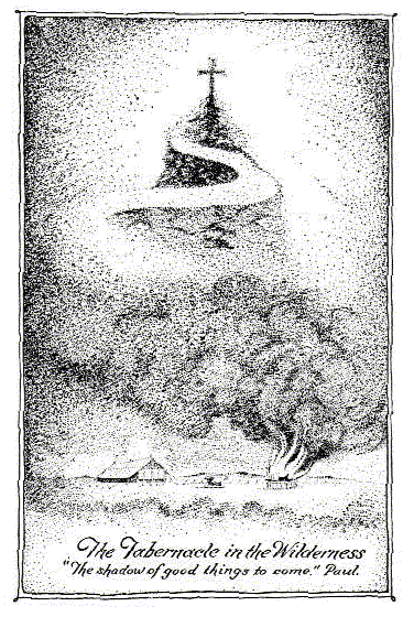Paul in his letter to the Hebrews gives a description of the Tabernacle and much information about the customs used there which it would benefit the student to know. Among other things note that he calls the Tabernacle "a shadow of good things to come." There is in this ancient Mystery Temple a promise given which has not yet been fulfilled, a promise that holds good today just as well as upon the day it was given. If we visualize in our mind the arrangement of things inside the Tabernacle, we shall readily see the shadow of the Cross. Commencing at the eastern gate there was the altar of burnt offerings; a little farther along the path to the Tabernacle itself we find the Laver of Consecration, the Molten Sea, in which the priests washed. Then upon entering the East Room of the Temple we find an article of furniture, the Golden Candlestick, at the extreme left, and the Table of Shewbread at the extreme right, the two forming a cross with the path we have been pursuing toward and within the Tabernacle. In the center in front of the second veil we find the Altar of Incense, which forms the center of the cross, while the Ark placed in the westernmost part of the West Room, the Holy of Holies, gives the short or upper limb of the cross. In this