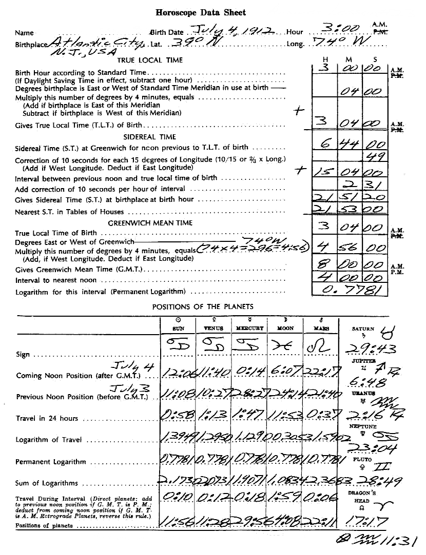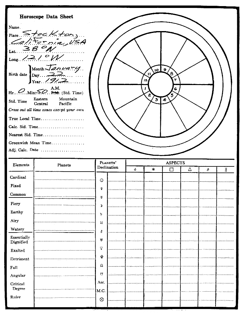 1. When you have studied this Astrology Independent Study Module, please set up the practice horoscope below [Birth Place: Stockton, CA, USA; Lat.: 38 deg. N.; Long.: 121 deg. W.; Birth Date: January 22, 1912; Birth Time: 0:50 A.M.]. (Optional)