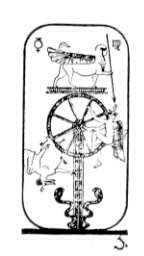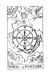 We have shown two cards here — that of the Egyptian series popularly called the "St. Germain," although there is no proof that Count St. Germain was responsible for these cards, and that of the A. E. Waite series. Mr. Waite interprets the four strange figures shown on the Egyptian wheel as representing the four Beasts of Ezekiel's Vision, which we see again in the XIXth Tarot.