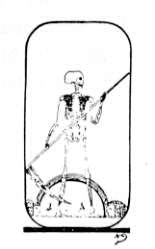 Here we see a skeleton, scythe in hand, with which he is mowing down the figures of human beings, who have fallen into a trench or grave, from which heads, hands, feet and limbs obtrude.