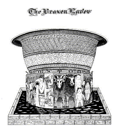 The Brazen Altar was placed just inside the eastern gate, and it was used for the sacrifice of animals during the temple service. The idea of using bulls and goats as sacrifices seems barbaric to the modern mind, and we cannot realize that they could ever have had any efficacy in that respect. The Bible does indeed hear out this view of the matter, for we are told repeatedly that God desires not sacrifice but a broken spirit and a contrite heart, and that He has no pleasure in sacrifices of blood. In view of this fact it seems strange that sacrifices should ever have been commanded. But we must realize that no religion can elevate those whom it is designed to help if its teachings are too far above their intellectual or moral level. To appeal to a barbarian, religion must have certain barbaric traits. A religion of love could not have appealed to those people, therefore they were given a law which demanded "an eye for an eye, and a tooth for a tooth."