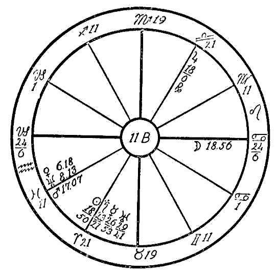 In 1914 we find the progressed Sun in the first degree of Scorpio, and the progressed Moon in the sign Aquarius forming an opposition to the Ascendant and the radical Jupiter in Leo. It is also coming up to a square of the radical Saturn, Mercury, and Uranus in Scorpio. In this same year two new Moons afflicted the three latter planets. The one on January 26th fell in five degrees of Aquarius in opposition to Jupiter and square to Saturn and Mercury. On April 25th the new Moon fell in four degrees of Taurus, square to Jupiter and opposition Saturn and Mercury. This was the time when —