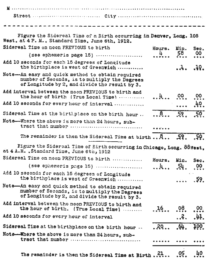 Even the numbers in the other narrow columns covering the 11th, 12th, 2nd and 3rd houses often correspond, but (mark this carefully) the Ascendant is always different for every degree of Latitude. As this is one of the most important points in the horoscope, the student is cautioned to be very careful to find the right sidereal time in the right table, for an error at this point will throw the whole horoscope off and make it less valuable by causing an error in the location of the houses.