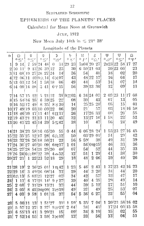 Now suppose that the Moon is in Aries 26 at one noon and moves to Taurus 8 by the next noon, and you wish to find out how far she has gone. You wish to subtract Aries 26 from Taurus 8 thus: