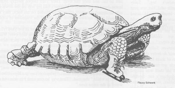 They soon found out why he needed protection. He would walk just so far, and then fall over. Their yard sloped steeply from the house down to the fence. If Dumbo's bad leg was on the down-slope side he tipped over very easily. If he landed on his back, they knew he could never turn over. That was one of the tragedies of a turtle's life.