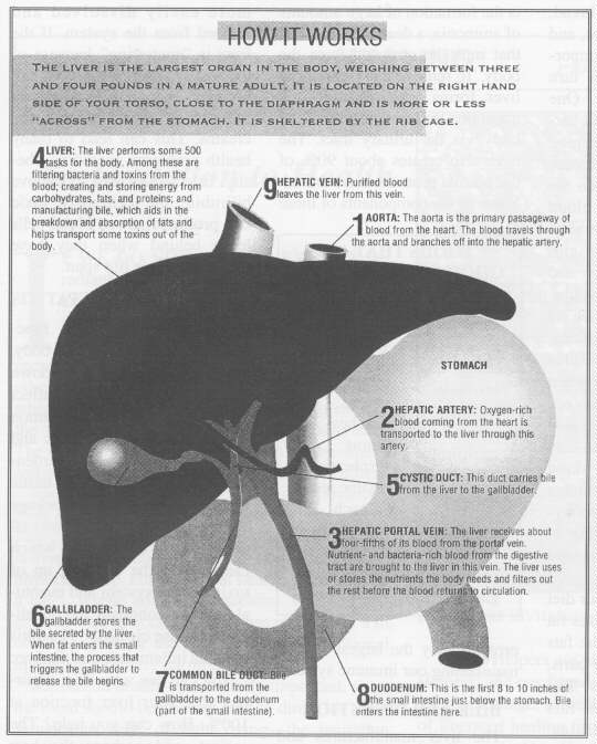 Because of the many functions the liver has in the body, any slowing down or breakdown of the liver can seriously affect us. Two of the more common liver diseases are cirrhosis and hepatitis. Cirrhosis, or hardening, is the scarring of liver tissue and the corresponding blockage of the blood flow. This slows all the functions of the liver, which can lead to the building up of toxins in the system and eventual death. Alcoholism and hepatitis can cause cirrhosis. Hepatitis is a viral inflammation of the liver.