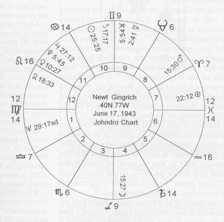 This is perfectly in keeping with the celestial birth certificate of Newt Gingrich. Given his Moon of personality in Sagittarius, conjunct a critical degree and his I.C., strongly aspected and part of a grand trine in fire-the above characterization is to be expected. All the more so since, by mutual reception, the lunar orb is joined by jolly Jupiter. Add to that the fact that before he took the gavel, the Sun was making its annual transit over his natal Moon, and transiting Jupiter and Pluto were also approaching.
