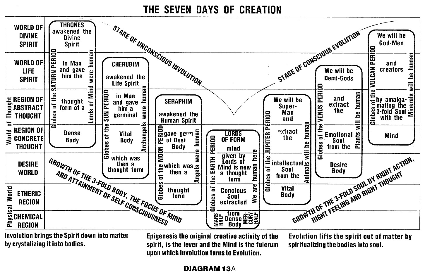 The first aspect of the Supreme Being "thinks out," or imagines, the Universe before the beginning of active manifestation, everything, including the millions of Solar Systems and the great creative Hierarchies which inhabit the Cosmic Planes of existence above the seventh, which is the field of our evolution (See Diagram 6). This is also the Force which dissolves everything that has crystallized beyond the possibility of further growth and at last, when the end of active manifestation has come, reabsorbs within Itself all that is, until the dawn of another Period of Manifestation.