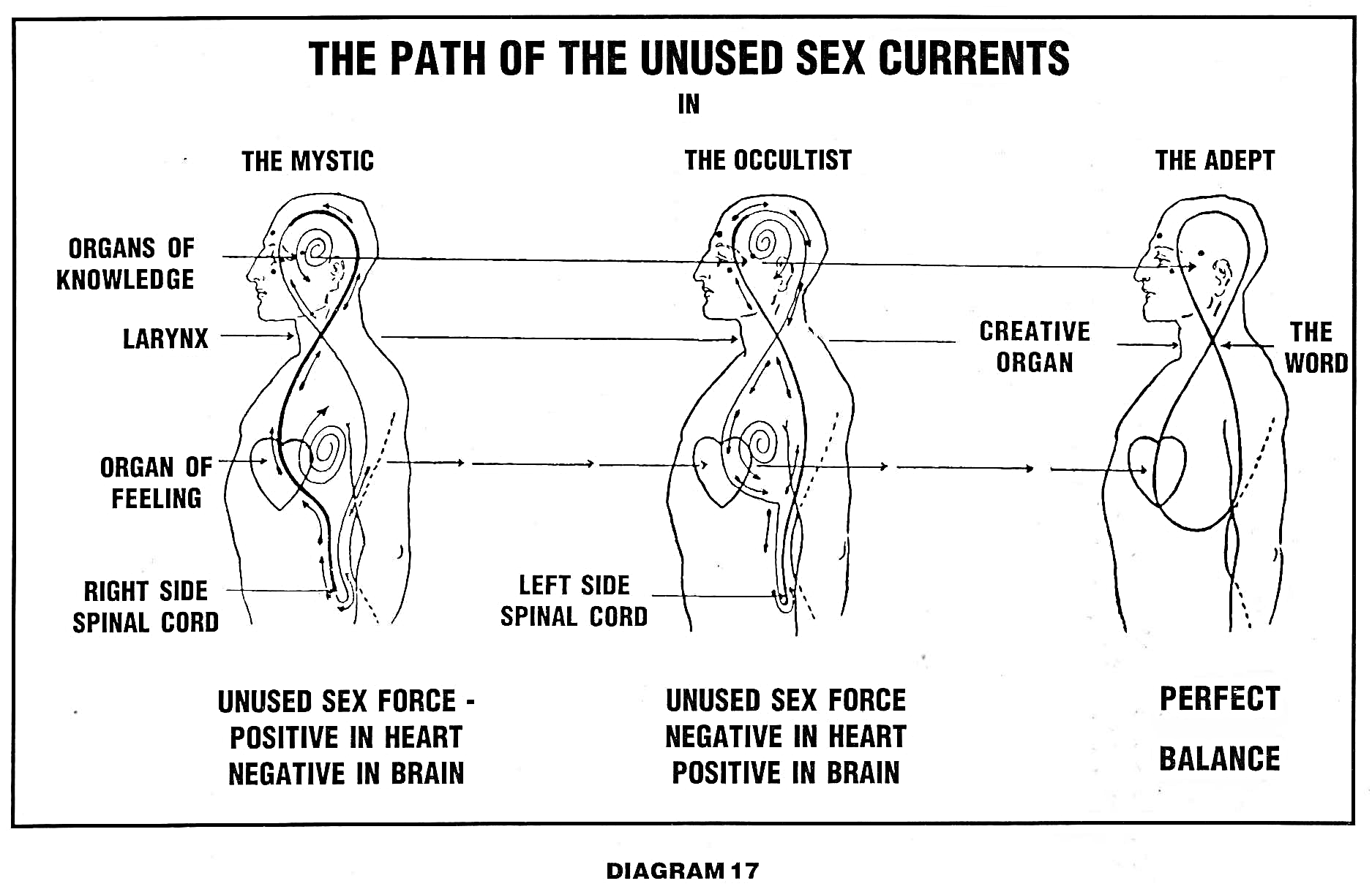 These currents do not usually take one of the two paths indicated in Diagram 17 to the entire exclusion of the other, but generally one path is traveled by the greater volume of the sex-currents, according to the temperament of the aspirant. In one who is seeking enlightenment along purely intellectual lines the current travels particularly over the spinal cord and only a small part goes over the path through the heart. In the mystic who feels rather than knows, the currents find their way upwards through the heart.