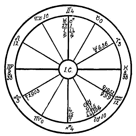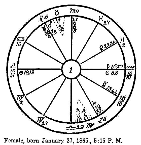 We find that there are common signs on the angles, which is a testimony of a flexible character, difficult to rouse from sickness or trouble into which the native may fall. The Moon in conjunction with Saturn in Aquarius, the sign which governs the ankles and lower parts of the limbs, is evidence of a poor circulation; and Uranus in Leo, the sign of the heart, in opposition to the Moon and Saturn shows that there is a fluttering of that