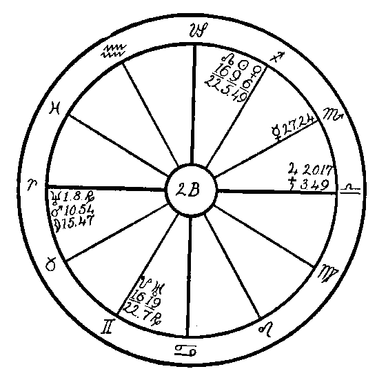 There were a number of good aspects in the horoscope, which always make for safety, especially Mars trine the Sun, which gives great recuperative power. In looking for the afflictions we find Mercury opposition to the Pleiades in Taurus, and the Sun and Venus conjoined to Antares. The Pleiades and Antares are fixed stars which have direct influence over the eyesight; especially is this true when they are afflicting the Sun and Mercury.