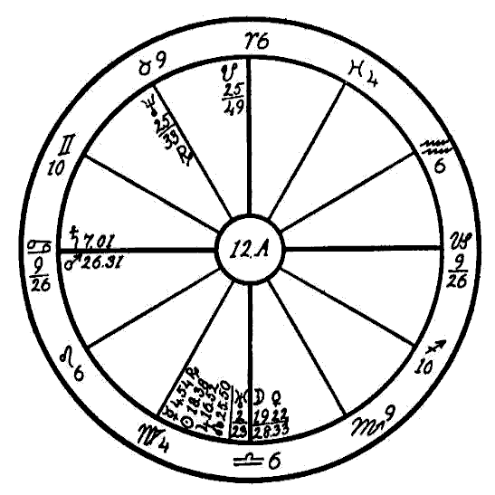 Jupiter in the nervous sign of Gemini afflicted by the opposition of the obstructing Saturn and nervous Mercury, also square to the inflammatory Mars in the sign of Virgo, the small intestine, are indications similar to those in horoscope 11H. This man suffered from numbness in the arms and hands. The great strain put upon his system and the abuse of the poor stomach caused neuritis, as both the venous and arterial circulations are afflicted from the signs ruling the nervous system.