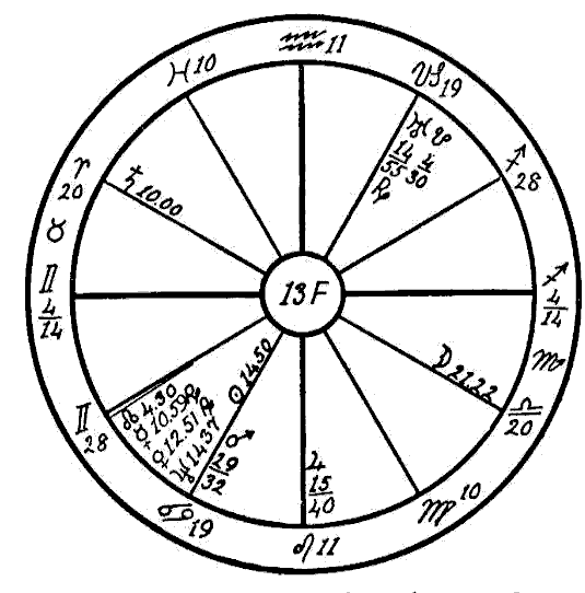 We will first diagnose horoscope 13D, where we find the common sign of Sagittarius on the Ascendant with the ruler, Jupiter, retrograde, and in its own sign in the 11th house, trine to the life-giving Sun, but square to the obstructing Saturn, which is in the sign of Pisces, another common sign. We find the Sun making only good aspects. The Moon is square the Ascendant and in conjunction with the desire body Dragon's Head, which has a Jupiterian influence, sextile to Mars and Venus, and trine to Jupiter. These configurations should give much vitality and be a strong factor for health in this horoscope. Now why should a man with so few afflictions have become an invalid?