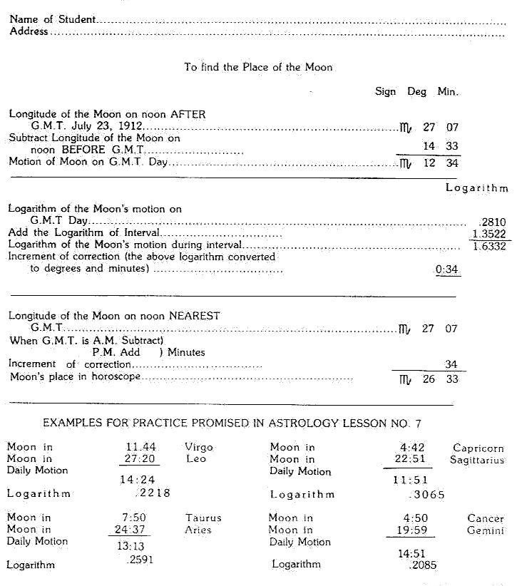 Rule No. 1 given in the last Independent Study Module directs us to subtract the position of the planet we wish to correct on the noon preceding the G.M.T. from its place on noon after G.M.T. These are found on page 16 of the ephemeris for 1912, in the Moon column, for that is the next planet to be calculated.