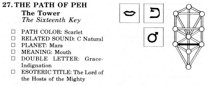 Phe or Pe is the seventeenth in the procession of Hebrew letters; and it is also one of the double letters, having two sounds; and it is in addition one of the "finals," or letters which are written in a special way when they occur at the end of a word. There are five consonants which have these "final" significators; they are: Kaph, Mem, Nun, Phe and Tsaddi. These "finals" are not to be confused with the "doubles," which are: Beth, Gimel, Daleth, Kaph, Phe, Resh and Tau. Numerically, Phe is the significator of the number 80, which is the eighth sublimation of the decad. As there are Ten Sephiroth, so there are, in reality, ten cosmic planes upon which all of the Sephiroth manifest. The grand divisions, however, are the four given in another place: Atziluth, the World of Emanations; Briah, the World of Creation; Yetsirah, the World of Formations; and Assiah, the World of Action.
