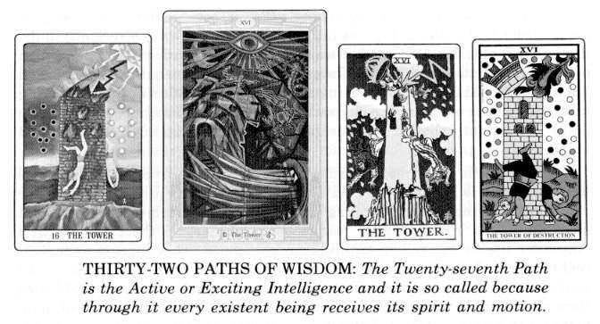 The Tarot glyph is a tower struck by lightning. Adam and Eve-generic terms for mankind, for male and female-are seen in desolation and isolation, for the tower (protective aura) that formerly shielded them no longer does so. They are falling into materiality (coats of skin) and only by their own individual efforts and labors can they be restored to their spiritual estate. Christ Jesus cannot of Himself save men but He can and does help man to save himself. We cannot buy salvation any more than we can buy nourishment for our bodies through someone else eating food for us.