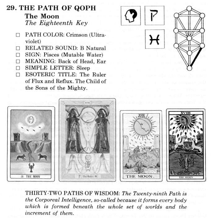 Tzaddi prepares us for the highest power of Nine (9). We noted in the study of the ninth Arcanum that 9 is the number of Initiation and also of humanity. In the study of the ninth Tarot Arcanum we noted the development of Wisdom, which is the foundation of all true Initiation. In the eighteenth Tarot Arcanum we note the number 9 in its relationship to the ninth cosmic plane, for it signifies the ninth phase or plane of the decad.