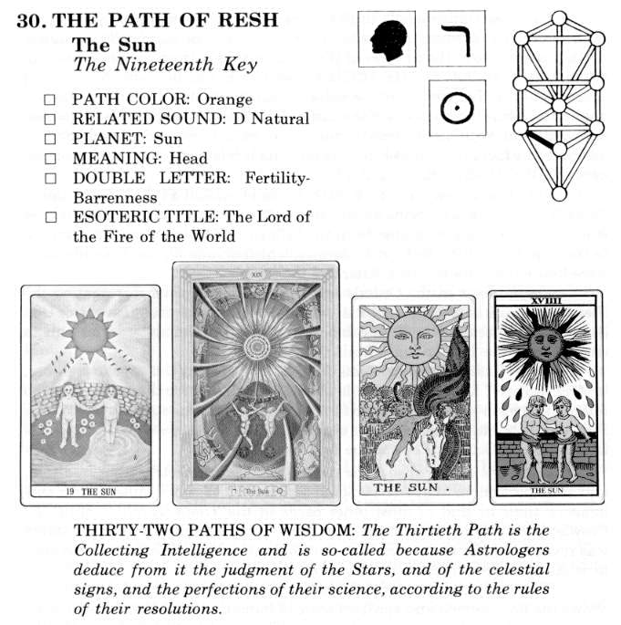 Numerically Resch is 200, which reduces to 2, the number of the first manifestation of the feminine or formative principle, Beth. Its keyword is Redemption — for Resch signifies the end of the struggle for self-mastery, the culmination of the Great Work.