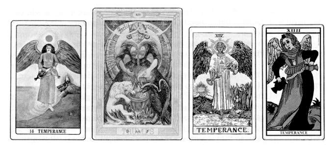 We noted in the fourteenth Tarot Arcanum a beautiful angel maiden who was conserving the sacred Elixir or Life, or the Holy Spirit essence within herself.