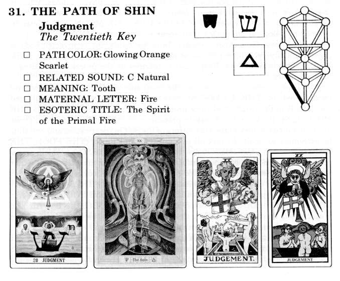 The Tarot glyph is an angel with wings of fire. He carries a trumpet decorated with a banner marked with a cross. This represents completion of the mystery of spirit as it is concerned with man's eventual and final unfoldment. Below the angel is an open grave from which issue forth a man, a woman and a child (symbolic of the human race). This is one of the most exquisite portrayals of the processes of Illumination and Resurrection ever given to man.