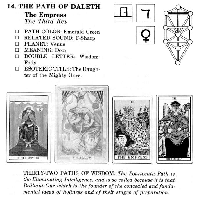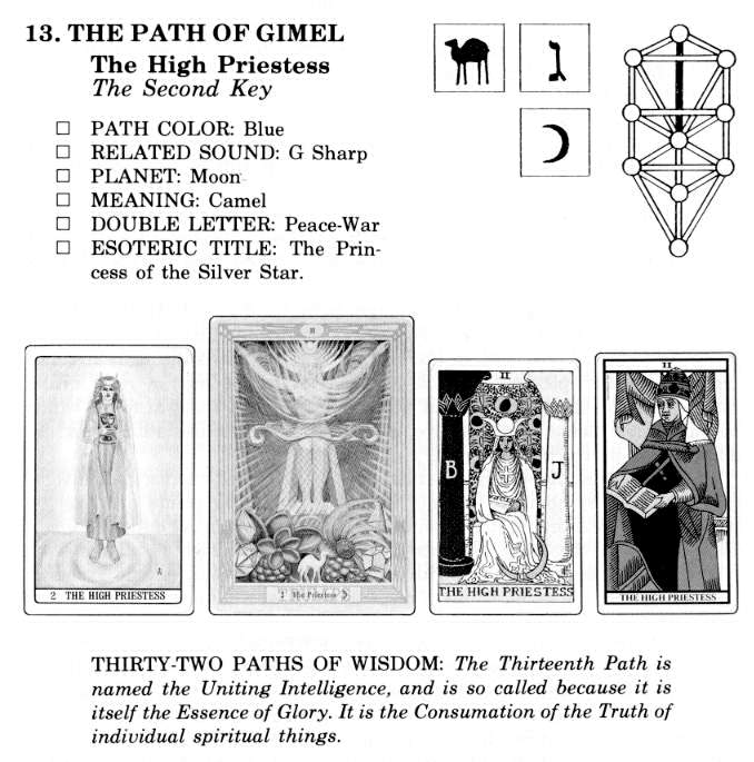 On the high plane of divinity or God-Consciousness, the High Priestess denotes the Glory of Shekinah, the manifested Presence of God as she begins to reveal Herself to her children, the Initiates. This is the "upper" Shekinah of the Kabbalah; the Shekinah of the Mysteries. In the next Tarot card we are shown the "lower" Shekinah, not as a "fallen feminine," but as God's manifestation in the realms of Nature. The disciple is taught to relate these two aspects of the Divine Feminine as being the manifestation of God on the inner and the outer planes of Nature.