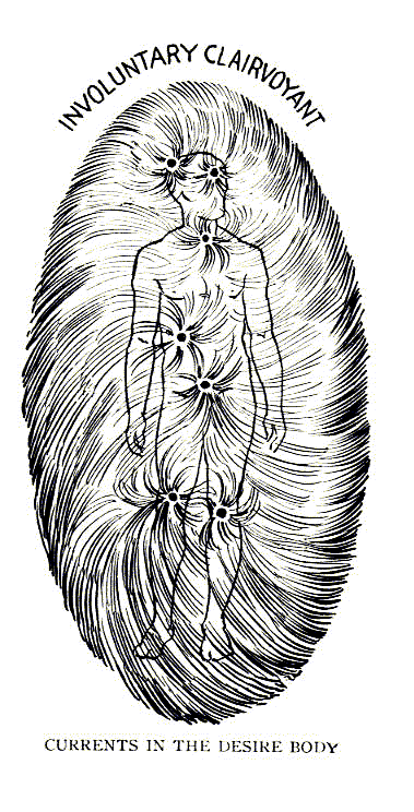 As has been previously explained, the desire body is an unorganized ovoid, holding the dense body as a dark spot within its center, as the white of an egg surrounds the yolk. There are a number of sense centers in the ovoid, which have appeared since the beginning of the Earth Period. In the average human being these centers appear merely as eddies in a current and are not awake, hence his desire body is of no use to him as a separate vehicle of consciousness; but when the sense centers are awakened they look like whirling vortices.