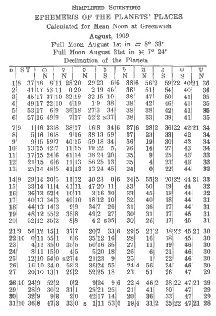 To find which planet rules a certain hour, look at your timepiece and consult the table for the current month. Run your index-finger down the column for the latitude in which you live. Stop when you come to the first time which is later than the time indicated by your watch. Move up one step. The figure found there indicates that the planetary ruler commenced to rule at that time and will continue in power till the time at which you first stopped.