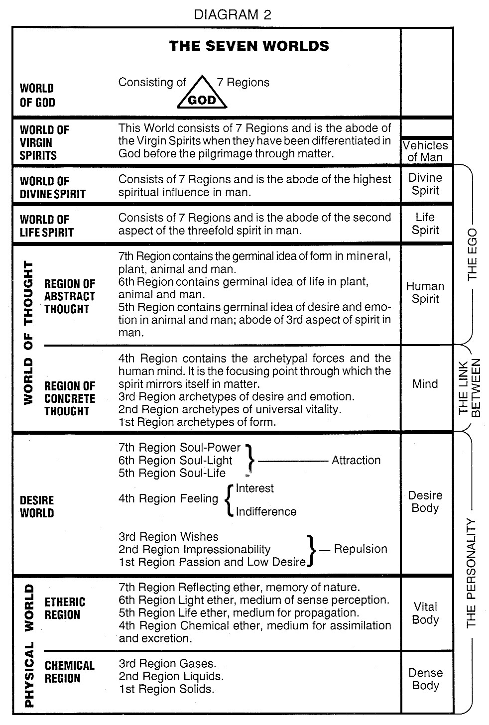 Diagram 2 will give a comprehensive idea of the seven Worlds which are the sphere of our development, but we must carefully keep in mind that these Worlds are not placed one above another, as shown in the diagram. They interpenetrate — that is to say, that as in the case where the relation of the Physical World and the Desire World was compared, where we likened the Desire World to the lines of force in freezing water and the water itself to the Physical World, in the same way we may think of the lines of force as being any of the seven Worlds, and the water, as in our illustration, would correspond to the next denser World in the scale. Another illustration may perhaps make the subject clearer.