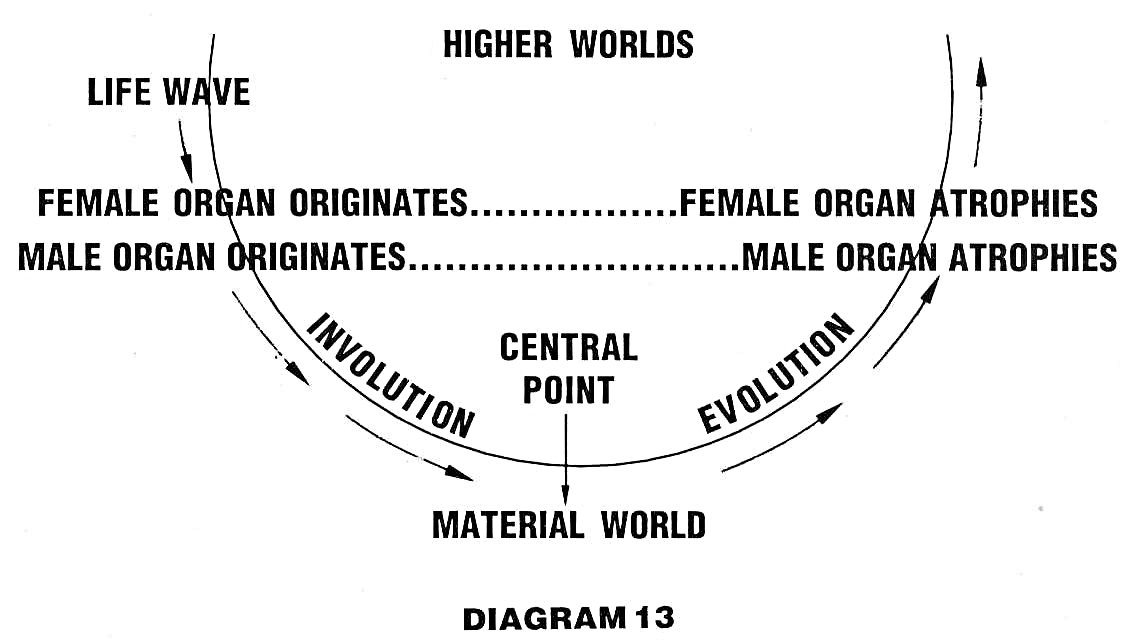 All that was manifested during the descending period of involution remains until the corresponding point on the ascending arc of evolution has been reached. The present generative organs will degenerate and atrophy. The female organ was the first to come into existence as a separate unit and, according to the law that "the first shall be last," will be the last to atrophy. The male organ was differentiated last and is even now commencing to divide itself from the body. Diagram 13 (below) will make this clear.