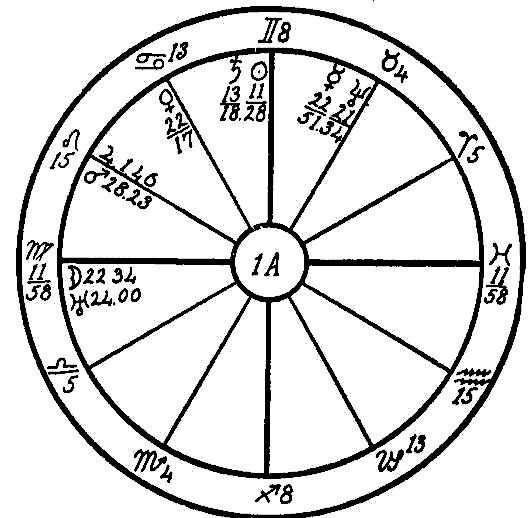 Worry over financial loss aggravated the eye trouble from which he had suffered for a number of years. He has been an incessant reader and has put a heavy strain on his eyes. The mental disturbance over his financial loss weakened the nervous system, causing him to lose the sight of one eye. We find the Moon in 29 degrees of Taurus conjunction the Pleiades and square to Neptune; Jupiter is in 10 degrees of Gemini in the 6th house, that of sickness, in opposition to the fixed star Antares, which is situated in 8 degrees of Sagittarius; also Jupiter is making a square to the obstructing Saturn, all indicating eye trouble.