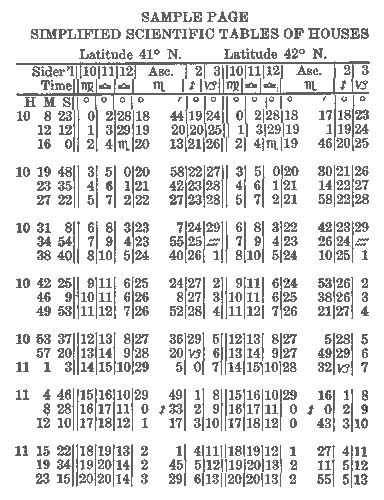 A table calculated to show what signs and degrees of the Zodiac are on each of the cusps of the twelve mundane houses at any time during any day or night in the year.