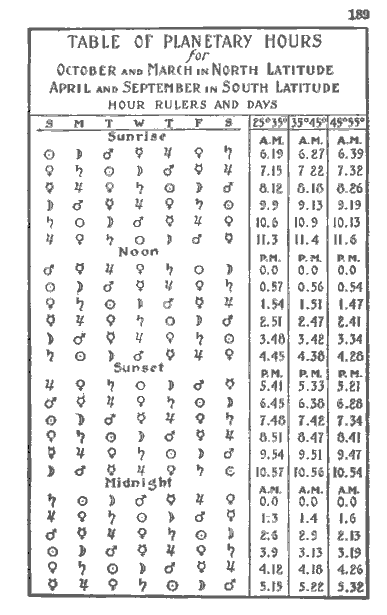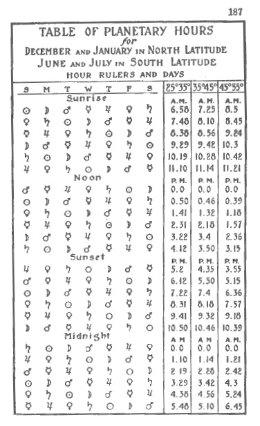When we speak of planetary 'hours,' it must be understood that these hours are not sixty minutes in length, but vary in a wide measure, with the time of the year, and the place of your residence. Near the equator the divergence is least; and it increases the further North we go because a planetary hour is one twelfth part of the time between Sunset on a particular day and Sunrise the next morning, or it is one twelfth part of a particular day beginning at Sunrise and ending at Sunset.