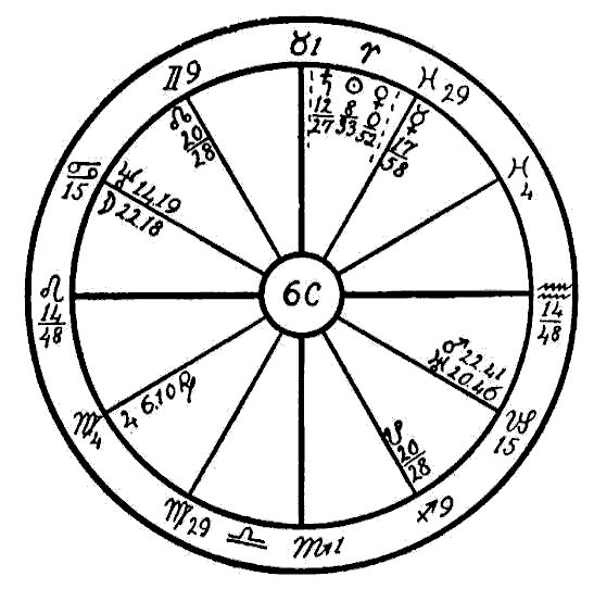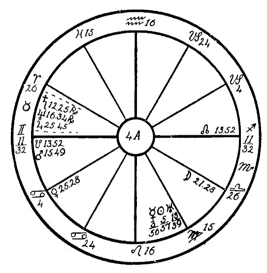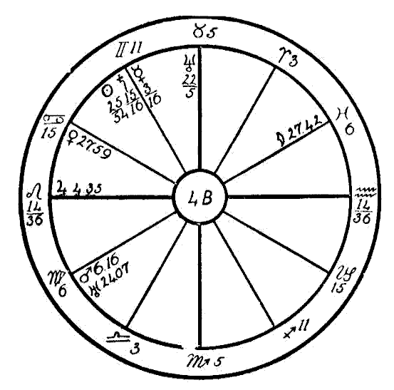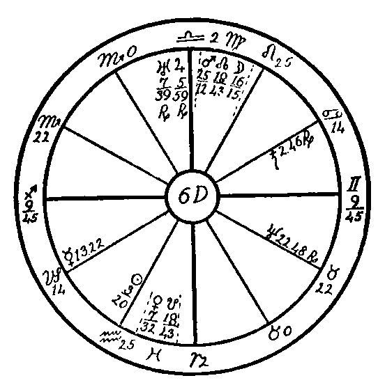 You will notice that the last degrees of Libra are rising so that the native has really more of the impulsive Scorpio characteristics than those of Libra. Mars, ruler of Scorpio, in Leo adds to his energy and makes him fond of swaggering and showing off, prodigal of his vitality. Mars trine Mercury in Sagittarius shows an inclination for sport and probably overexertion, which may have been responsible for the first breakdown about the twenty-eighth year when the progressed Moon was over the place of the radical Moon and Venus, or the year preceding when it was in opposition to Saturn.