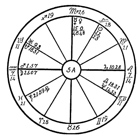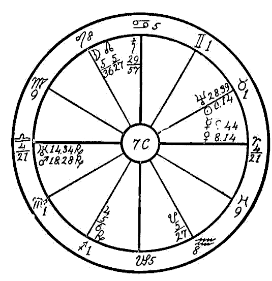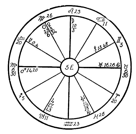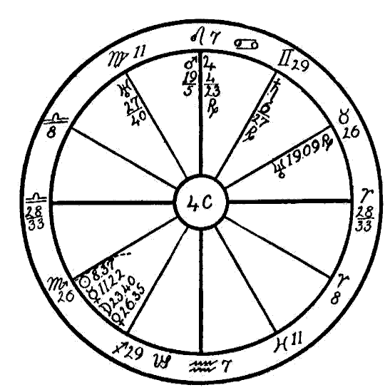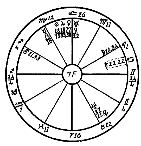 The common sign of Virgo is on the Ascendant and common signs on all the angles. In this horoscope we will show the law of the vicious circle, which the doctors are so interested in and which is so baffling, and how this law proves the truth of the statement quoted from the Cosmo-Conception.
