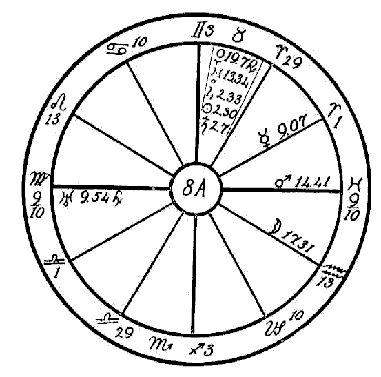 It is always possible to make the lesson stronger by using two horoscopes. In this case we will begin with the horoscope numbered 8A, which is that of man born April 22nd, 1881, at 2 P.M.