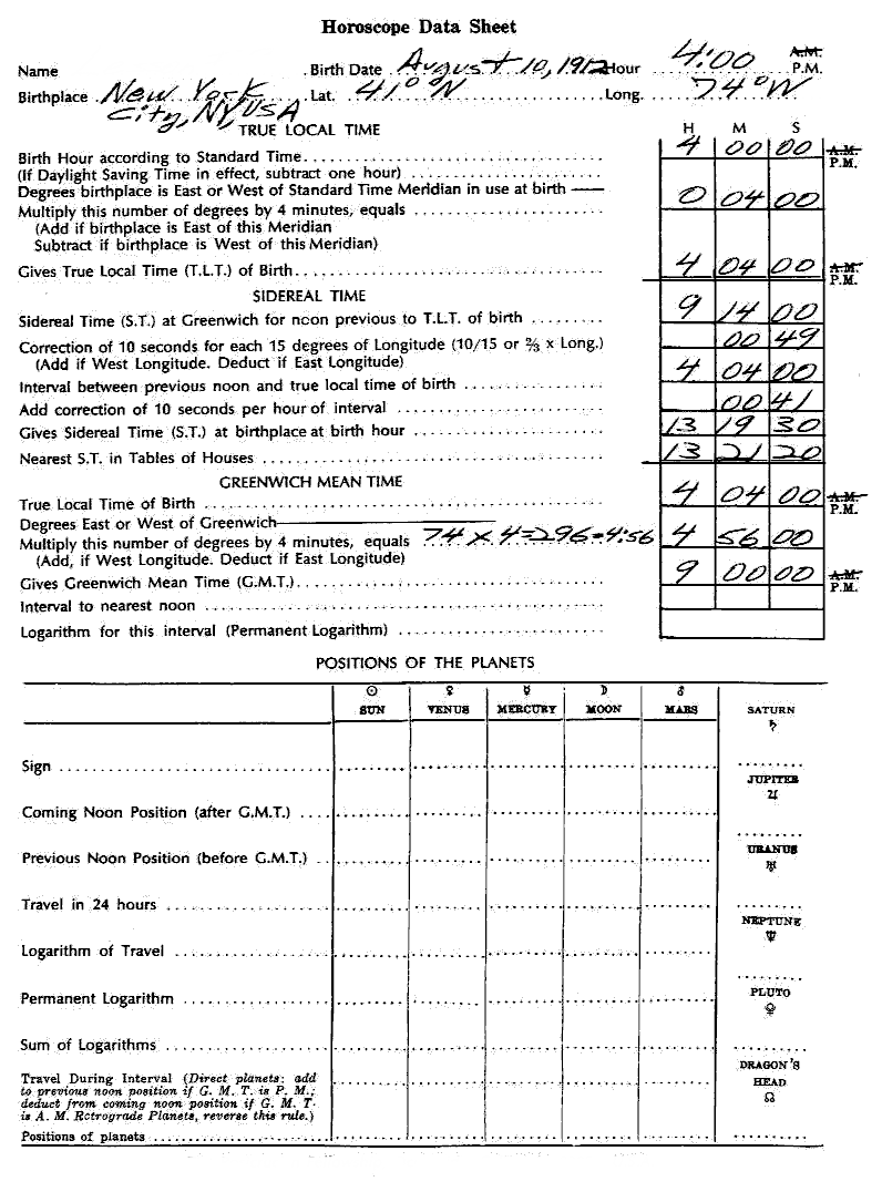 Tabulating the monthly positions of the progressed Moon for this year-period — from the fifteenth of each month — reveals that during the last two weeks of March, 1947, the progressed Moon makes the exact conjunction of his Mercury. In early June it makes the exact square of his Mars. In early August it makes the exact sextile of his Venus. (On the outside of your practice chart indicate these Moon positions. Tabulate these aspects and dates, at the bottom of the page. Bracket them so as to impress your mind with the fact that you are dealing with a "field of stimulation.")