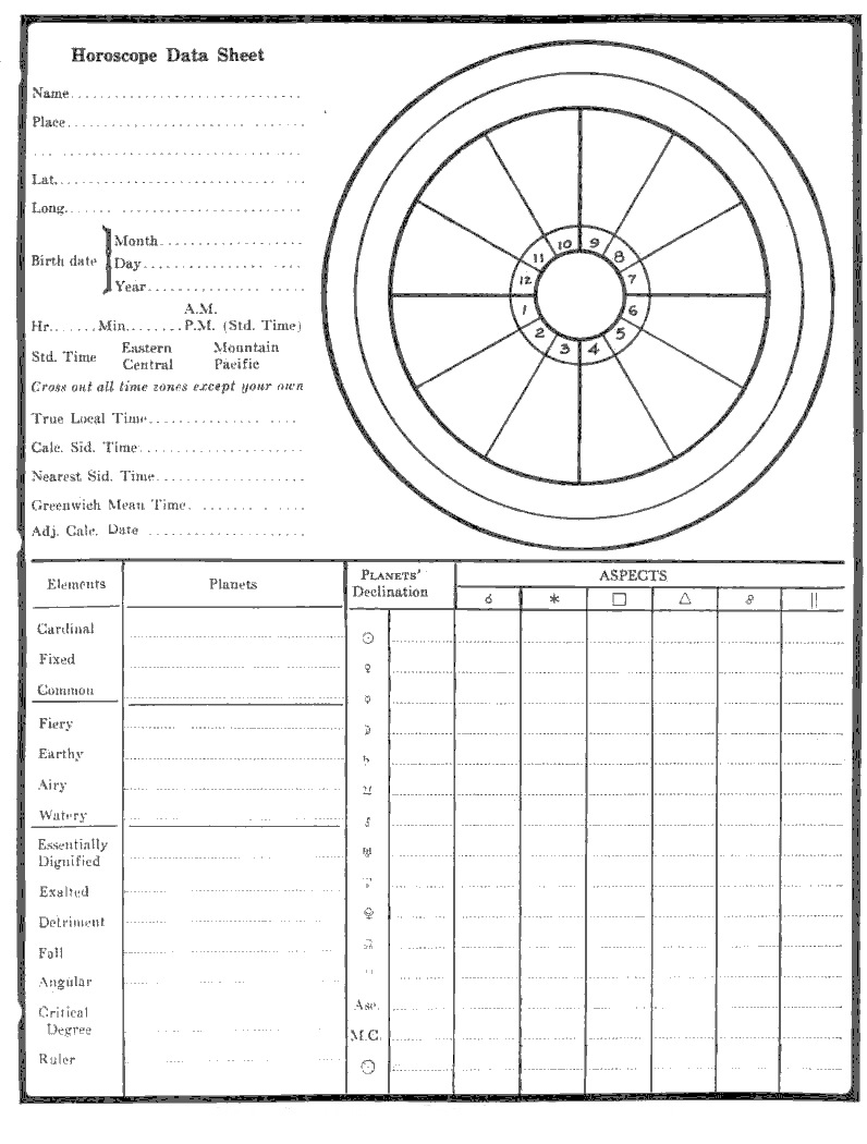In the next self-study module we shall commence reading a horoscope. That is a study of absorbing interest, but remember, do not love it for the knowledge or the power it will give you; love it for the good you can do with it, and your treasure will be great in heaven. May God bless your efforts.