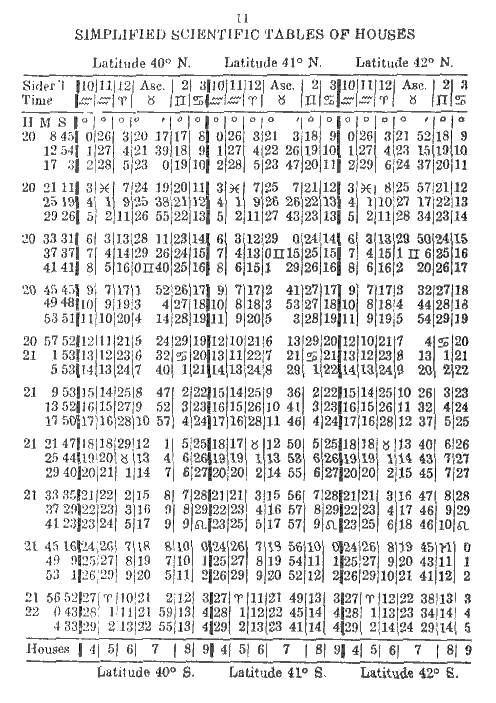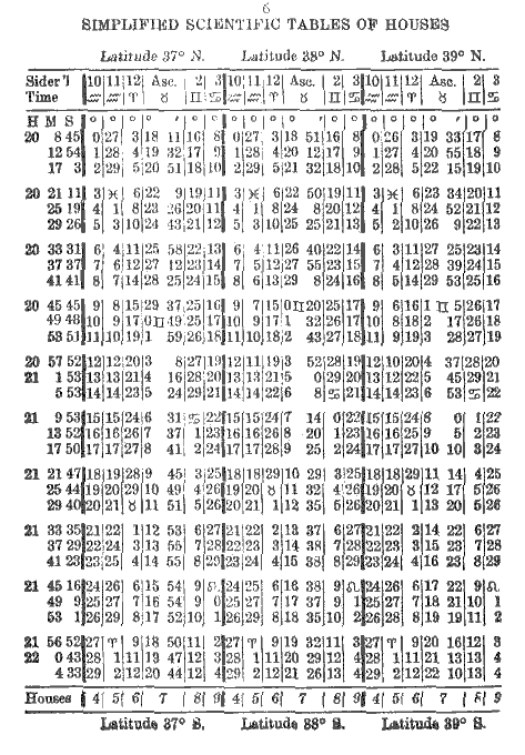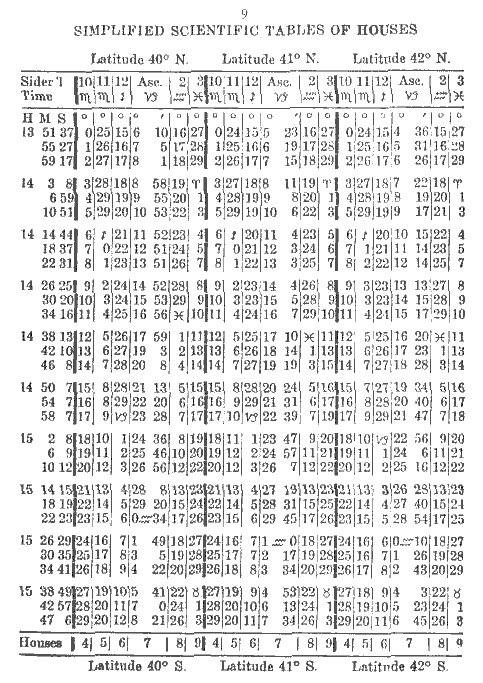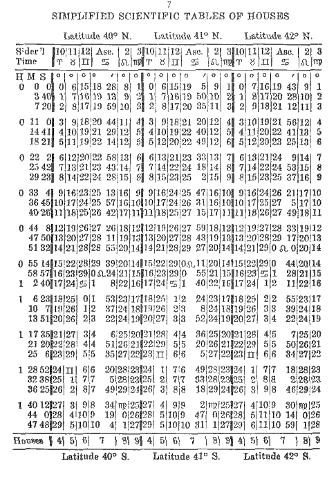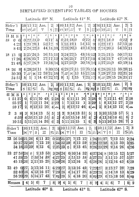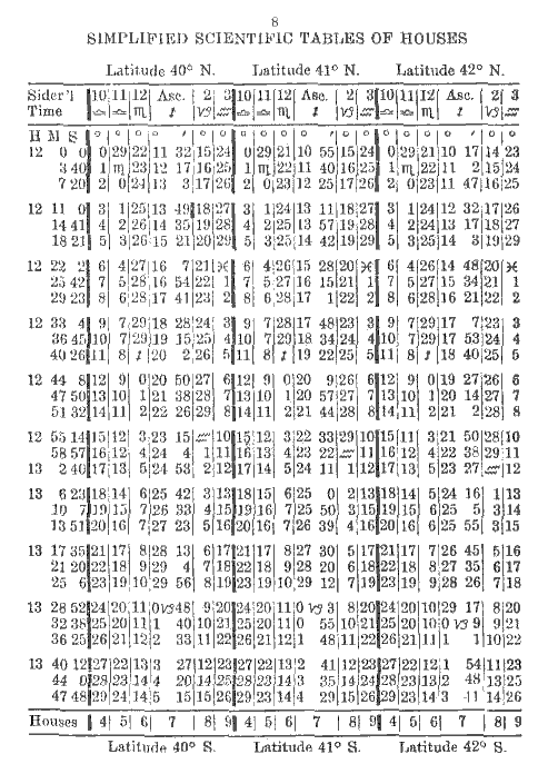 To erect a chart for South latitude simply add 12 hours to the Sidereal Time at birth. First proceed according to instructions given in Simplified Scientific Astrology and Study Modules 1 to 5 of the Astrology Course. Then to the calculated Sidereal Time add 12 hours; if the sum is more than 24, subtract 24 hours and the remainder will be the Sidereal Time at birth, for a birth occurring in South latitude. At the bottom of the page in the Tables of Houses you will see the word Houses followed by 4, 5, 6, 7, 8, 9; these are the houses you use, that is, you start with the 4th house instead of the 10th as usual. For example, if Cancer is on the 10th house, then in a chart for South latitude it will be on the 4th and Capricorn will be on the 10th house.
