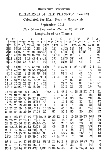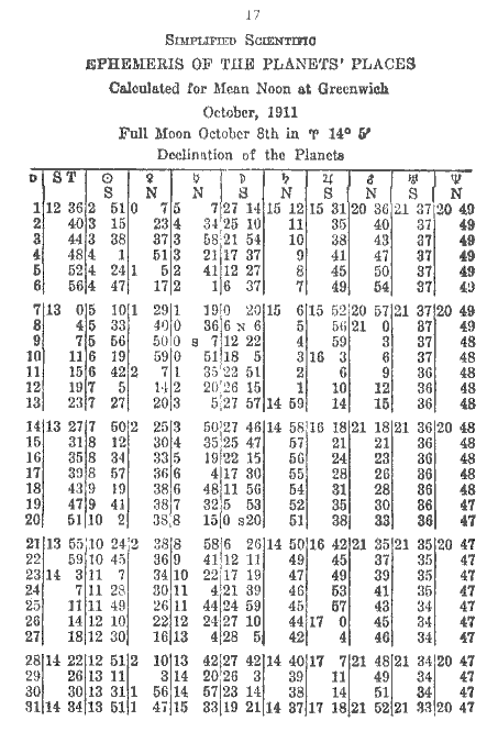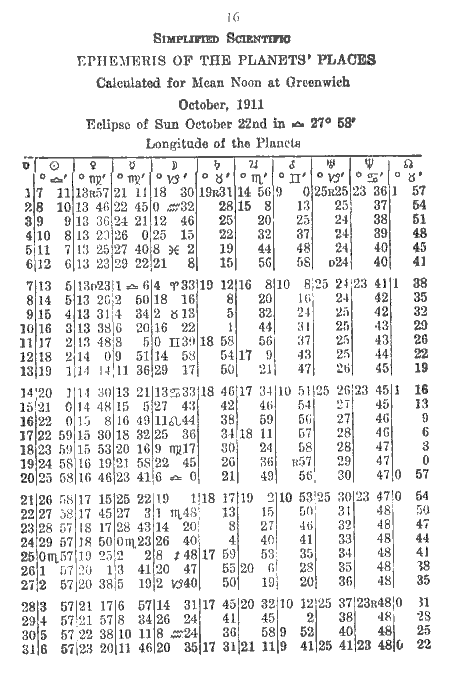 In the course of some years of correcting lessons in Astrology it becomes evident that there are certain particular questions which, although explained in the printed lessons, do not seem to be explained well enough. At least a great many students have trouble with them. These questions are concerned with time, both local and Greenwich, and with the directions in which the planets and the signs move or appear to move; also with the method of subtracting a certain degree and minute of one sign from a certain degree and minute of another sign in order to find out how many degrees a planet has traveled when it has moved from the first point to the second.