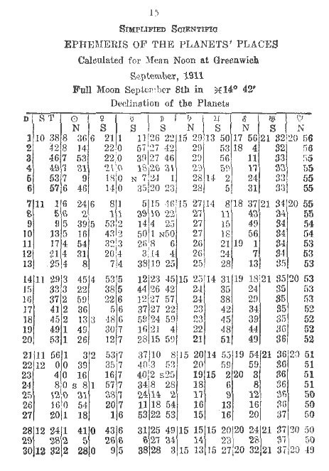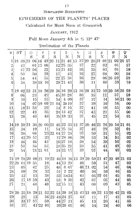 The declination of the planets should be copied directly from the ephemeris for the day having noon nearest G.M.T., with the exception of the Moon, which requires a logarithmic correction in accordance with the G.M.T. Correction is made by the same method used in obtaining the Moon's longitude. if the declination of the Moon be less on the coming day than on previous day, treat as a retrograde planet.