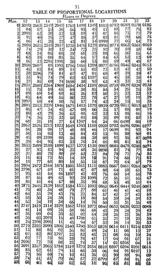 The logarithm for 5.08 is 6698. This added to the permanent log., 6812, equals 1.3510. This converted into time equals 1° 4'. Subtract from 20.33 and the result is 19.29, declination of Moon. An orb of 1 1/2 degrees is allowed for parallels.