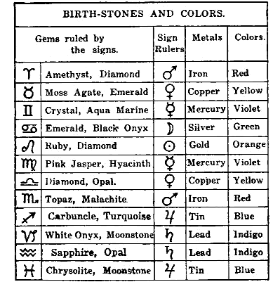 The following table shows the affinity of each of the twelve signs with certain gems, metals and colors, and in that chart there are the elements for making an effective talisman by any individual who has the knowledge of how to cast a horoscope and blend the ingredients according to the requirements of the case. We have no scruples about telling how this is done, for it may help some to help themselves and others. The only harm it can do is that it might induce some unscrupulous person to make tailsman for money and even then, if he is conscientious about the work, whoever obtains them will not be cheated, the reaction being upon the one who prostitutes the spiritual science for material gain.
