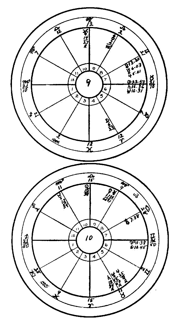 In this connection we present first figure No. 1, which is that of a boy, in 1912 about 16 years of age. The Fourth and Tenth Houses, the planets in them and their rulers show the parents. the parent who most influences the life is shown by the Tenth House configurations, and the Fourth House indicates the one lease concerned in the child's destiny.