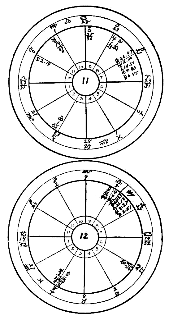 People are not congenitally affected, who have cardinal signs rising, particularly if cardinal or fixed signs also invest the Midheaven and Nadir, rarely become insane. The active nature forbids morbid tendencies and blues, disappointment is quickly thrown off and hope springs eternal in the cardinal breast urging to renewed struggle with conditions. It is said that the exception proves the rule, and when Capricorn rises the saturnine rulership gives a tendency to melancholy which under certain aggravating circumstances may provoke suicide, particularly when the ruler is cooped up in the Eighth House, as we see in horoscope No. 12. Virgo, a common sign, devoid of stamina, holds the Sun, Saturn, Venus, and the Moon in this, the house of death; this robs the person of joy in life and impels him to end it under stress of sorrow. Knowledge on the part of an astrologer friend has so far forestalled the calamity, and it is hoped, may save the poor man from committing so grave a crime.