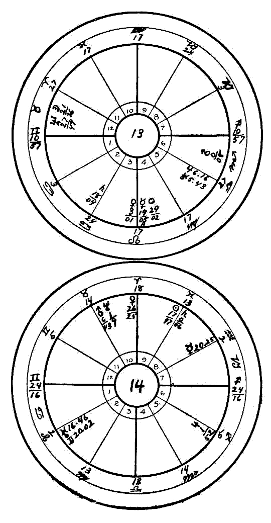 Saturn is the cause of melancholy and depression. Mars and Uranus produce the muscular and violent forms of insanity. Horoscopes 13 and 14 illustrate these peculiarities. No. 13 also shows the connection between puberty and the mental state. Gemini is rising, with Taurus and Mars intercepted in the Six and Twelfth Houses, from whence come disease and confinement. The Moon is in Taurus, which rules the larynx; she is in conjunction with Neptune, square to Mercury, and Mars is in Scorpio, which rules the generative organs. There we have at once the tendencies to a disease, which further accentuated by the fact that Neptune in Taurus squares the Sun in Leo, and Leo has rule over the heart, and is the prime factor in circulation upon which the life of the body depends; thus the threatened illness may be set down to trouble with the blood, produced by a nervous affection. Puberty occurs at the time when the Moon is in the opposite quarter from its place at birth. She entered Scorpio, the opposite of Taurus which held her at birth, at the time when the child was nearly twelve years of age. Up to that time the little girl had been bright, but the conjunction with Mars in Scorpio precipitated the period and robbed the growing child of vitality sorely needed at that time. The initial periods were few, but left her depleted of strength to withstand the square to Mercury and the opposition of the Moon to its radical place. (The radical place of a planet is its position at birth.) This affliction of Mercury, the ruler, by Moon at birth, was thus excited and insanity showed itself in consequence. As the affliction comes from fixed signs, we may judge it will be impossible to overcome, and the best that can be done for the poor soul is to pray for the day of its release, that it may have a better chance in a future embodiment.
