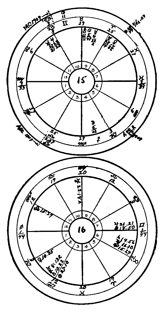 Horoscope No. 16 shows the natal configuration of an actress. Sagittarius is rising; Jupiter and the Moon are in close conjunction in Gemini, a mercurial sign, and are supported by a trine of the Sun; thus she had a most healthy constitution at birth, so far as the lung power is concerned. Mars and Mercury are also in an airy sign, giving energy to respiration and it thus seems as though this person were singularly well fortified against pulmonary trouble. But Saturn, Neptune and the Dragon's Tail in Taurus in the Sixth House, give a tendency to colds and contraction of the throat. Uranus in Virgo produces convulsive movements of the diaphragm and abdominal region; he is square to Jupiter and the Moon, and thus we see how graphically the stellar script pictures the tendency to convulsive coughing and hemorrhages which nearly brought the young woman to an early grave when Mars, by progression, came into conjunction with the radical Sun and vivified the square to Saturn. We rejoice to say that the good aspects first mentioned enabled the young woman to weather the storm; but close attention to diet, regular living and above all absolute continence are required to regain full physical strength, for there is much evidence to show that license played an important part in reducing the life forces and robbing her of the needed strength at the critical period.