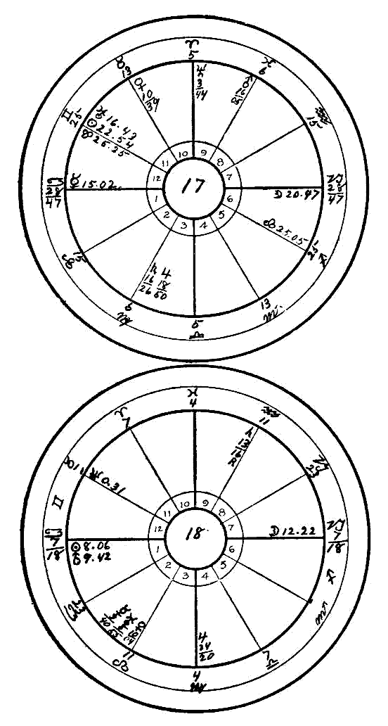 Horoscope No. 17 presents a number of diseases, but all have their root in an insatiable appetite fostered by the fact that the person is a professional chef. Venus in Taurus gives discrimination in food, and the sextile to Mercury in Cancer causes the mind to run in the direction of preparations wherewith to tickle the palate. But the Moon being ruler of Cancer, the rising sign, which has dominion over the stomach, shows that over-indulgences of the appetite will result disastrously. The distended stomach presses upon the heart, of which the Sun, our life-giver, is ruler. This planet is in Gemini, the sign which has dominion over the lungs, square to Mars in Pisces. Mars rules the iron in the blood and the Sun gives us oxygen, thus this square shows that the blood will lack in the life-giving element. The conjunction of the Sun with Uranus in Gemini produces spasmodic motion of the lungs and labored inspiration to obtain sufficient oxygen wherewith to supply the system; thus we have the condition called asthma. Saturn and Jupiter are in Virgo which rules the abdomen, square to the Sun and Uranus in Gemini, showing a lack of circulation and a tendency to ulcerous growths, and there is a general lack of nutrition in the whole system because of the great energy required to eliminate waste from the enormous quantities of food which this person consumes. Sad to say, however, persons in that occupation protest that they cannot help tasting, and that in spite of all ills they must eat to excess. It were wiser of course, to see another profession and train the system to moderation.